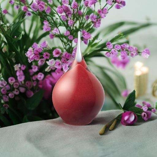 Rode druppelvormige glazen urn met ruimte voor 0,05l as van een overleden dierbare.