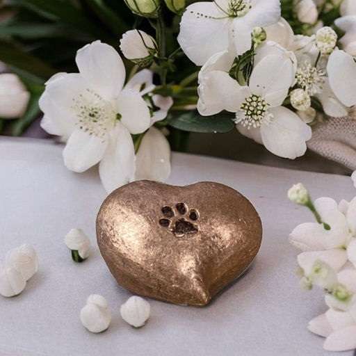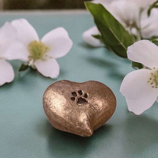 Keramische dieren urn ‘Troost’ hartje met hondenpoot met duurzame bronsfinish en ruimte voor as van een overleden huisdier.