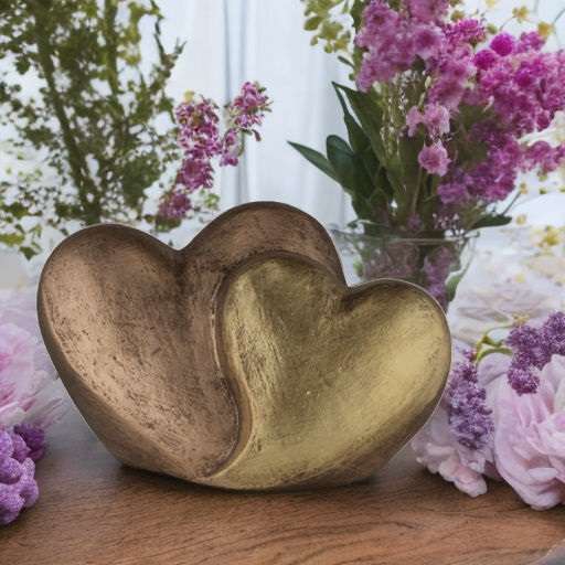Wij leveren deze dubbelhart urn, vervaardigd van keramiek in het brons en kunnen deze voor u voorzien van een gravure. Met een capaciteit van 1 liter is deze magnifieke urn perfect wanneer u deze BUITEN/BINNEN wilt neerzetten. Deze asurn in de vorm van een hart heeft een hoogte van 13 cm en een breedte van 19 cm en misstaat in geen enkel interieur. Wij kunnen deze asurn in ruwweg 3-4 weken leveren.