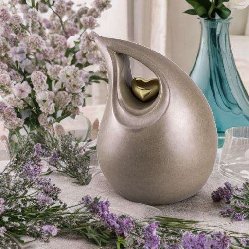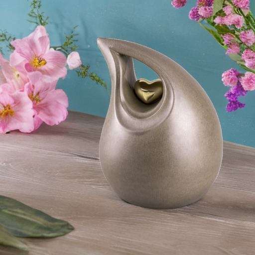 Een sierlijke druppelurn met een gouden hartje als symbool voor de blijvende liefde.